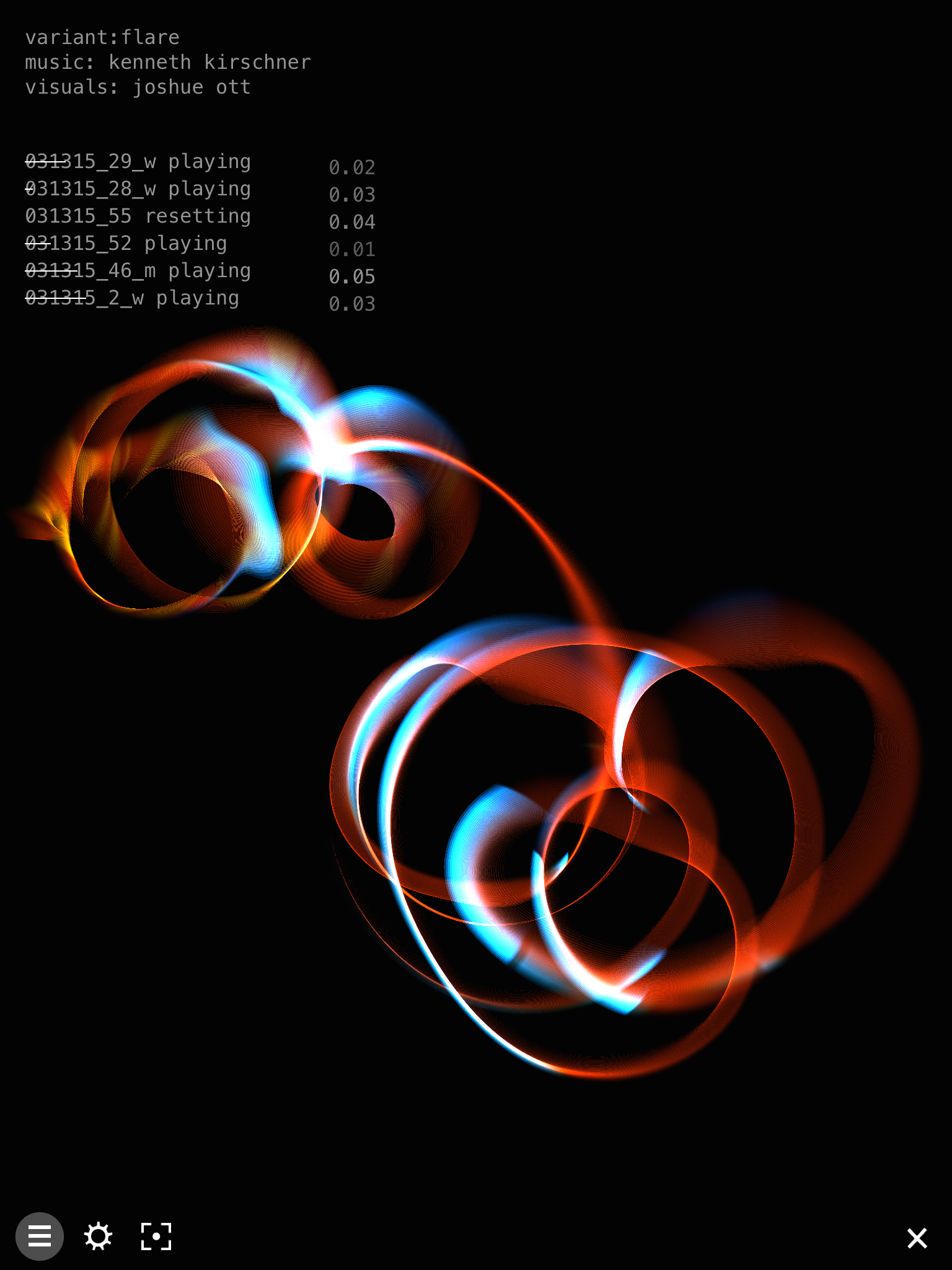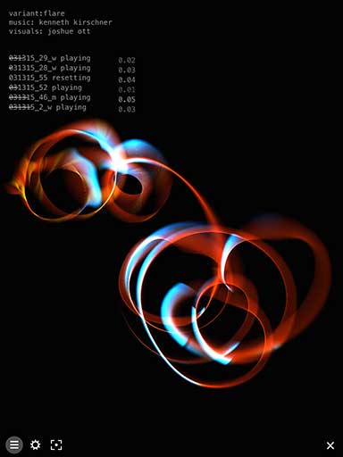 variant:flare is an experiment in minimalist interactivity, in which the user interacts through simple taps that move the musical composition gradually forward and alter its effects on the generatively evolving visuals.