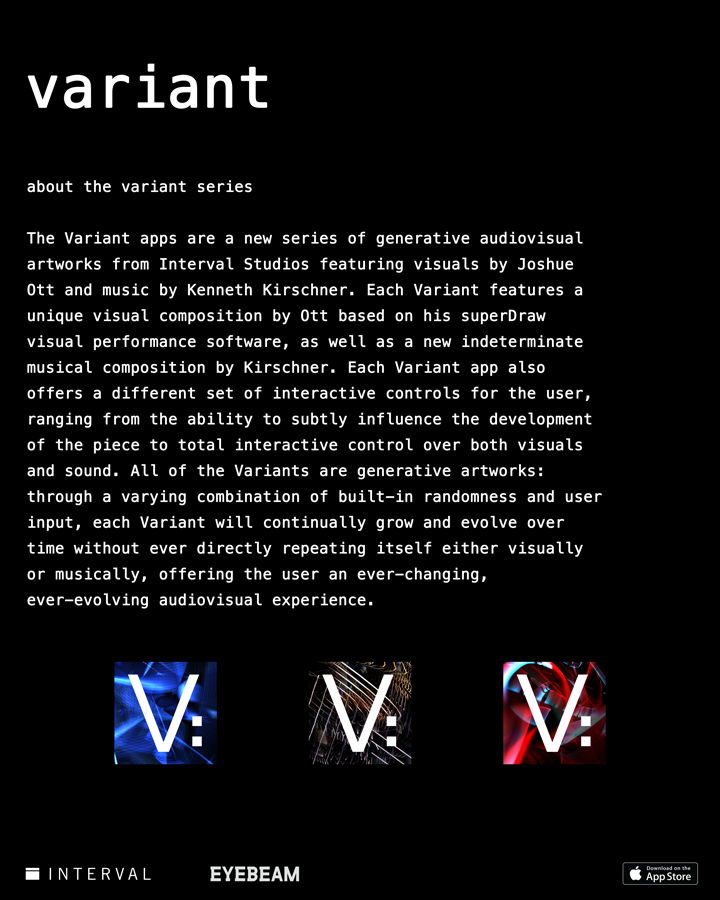 | Short Description | The Variant apps are a series of generative audiovisual artworks for iPad and iPhone from Interval Studios. |